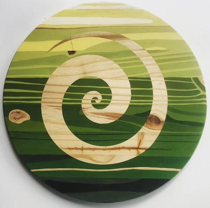 This is Spring. It is an acrylic painting on scrap wood. All of the work that I do in my own practice is painted on found wood or scrap wood. So it's part sustainability, trying to save these pieces from landfill. I source my materials on the side of the road in dumpsters, construction sites, carpenter excess. As I rescue them, I transform them into works of art worthy of having a second look. And so every line I paint is actually a line that is naturally in the wood. I'm just choosing which ones to pull out and really trying to draw attention to the natural beauty that we can find around us that is often overlooked. And it's a little bit of a metaphor, not only the beauty that we can find around us, but also trying to remind people of the beauty they can find within themselves that is often overlooked. And so this piece is part of a series that I did that was specifically focused on the seasons. Clearly, this one is about spring. It has a duality, though, of not only being spring the season, but spring, like the little metal spiral object.