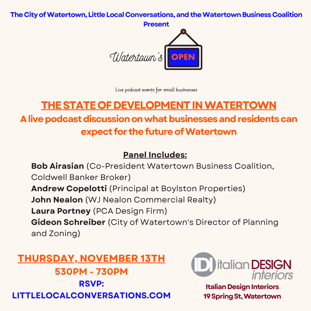 Join us for the next Watertown’s Open event at Italian Design Interiors at 19 Spring Street here in Watertown. There will be food and networking before a panel discussion with Bob Airasian (Co-President Watertown Business Coalition, Coldwell Banker Broker), Andrew Copelotti (Principal at Boylston Properties), John Nealon (WJ Nealon Commercial Realty), Laura Portney (PCA Design Firm), and Gideon Schreiber (City of Watertown's Director of Planning and Zoning).